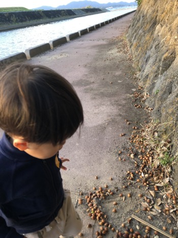玉湯川を挟んで反対の遊歩道はドングリが沢山落ちています!