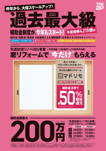 HOME現場ブログ日々のフォーシンク窓リフォーム補助金情報! 窓リフォーム補助金情報! 投稿日:2024年1月27日 カテゴリー:日々のフォーシンク現場日記メディア掲載情報その他・地域情報 大変お得な窓リフォーム補助金情報です。窓をリフォームすると断熱効果が高まり快適な住まいが実現できます!是非一度ご検討くださいませ。#広告#YKKAP#窓リフォーム#窓補助金#ドアリフォーム 日々のフォーシンク一覧はこちら 現場日記一覧はこちら メディア掲載情報一覧はこちら その他・地域情報一覧はこちら 現場ブログ一覧はこちら 最新の投稿 新社屋ストーリー⑮~外壁下地施工中~ 新社屋ストーリー⑭~施設内部の天井配線・空調の仕込み施工~ クリナップのユニットバス~ラクヴィア~のご紹介♪ お庭まわりリニューアルの施工完了です☆ 新社屋ストーリー⑬~土間配筋とコンクリート打設~ クリナップのシステムキッチン~ラクエラ~のご紹介♪ 新社屋ストーリー⑫~内部床下地施工~ 新社屋ストーリー⑪~屋根施工~ リビングの内装リフォーム完成です☆ 新社屋ストーリー⑩~外壁下地胴縁取付完了~ カテゴリー 日々のフォーシンク (343) 現場日記 (309) 建築士のリフォームお役立ちブログ (215) メディア掲載情報 (6) その他・地域情報 (12) 月別アーカイブ 2026年1月 (12) 2025年12月 (10) 2025年11月 (9) 2025年10月 (9) 2025年9月 (9) 2025年8月 (9) 2025年7月 (11) 2025年6月 (13) 2025年5月 (11) 2025年4月 (8) 2025年3月 (4) 2025年2月 (2) フォーシンクについて 選ばれる理由 会社案内代表挨拶会社概要アクセスマップ表彰実績経営理念・経営方針イマックスグループ情報 スタッフ紹介 施工事例 施工事例一覧 エコキュートリフォーム 窓リフォーム 1DAYリフォーム 内窓 こんな事もやります ペレットストーブ キッチンリフォーム お風呂リフォーム トイレリフォーム 洗面化粧台リフォーム LDKリフォーム 内装リフォーム 玄関・ポーチリフォーム 設備交換リフォーム 外構リフォーム 外壁リフォーム 屋根リフォーム リノベーション お客様の声 お客様の声一覧 商品ラインナップ おすすめ商品一覧 こんな事もやってます メンテナンス 建物診断 まごころサービスラインナップ 洗面化粧台 トイレ 玄関 床材 キッチン 浴室 お役立ち情報 フォーシンクのWEBチラシ 「中古を買って、リノベーション」という選択。 リフォームの流れ よくある質問 LINE見積もり 住宅省エネ2026キャンペーン 先進的窓リノベ2026事業 みらいエコ住宅2026事業 給湯省エネ2026事業 ブログ ブログ一覧 日々のフォーシンク 現場日記 建築士のリフォームお役立ちブログ メディア掲載情報 その他・地域情報 お問い合わせ お問い合わせ 無料お見積もり こちらもご覧ください