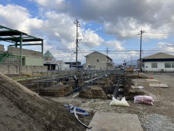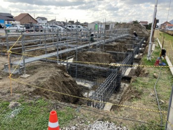 新社屋を支える為の骨組みになる鉄筋をしっかりと決められた位置やピッチで組み上げていきます!