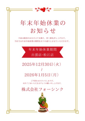 年末年始につきまして、下記の期間をお休みとさせていただきます。