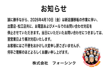 いつもフォーシンク出雲・松江店をご愛顧いただき誠にありがとうございます。