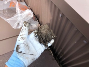↑軒樋から竪樋に雨水を流す”ドレン”という場所に大量の泥と葉が・・・↓片手ひとすくいでこの量・・・