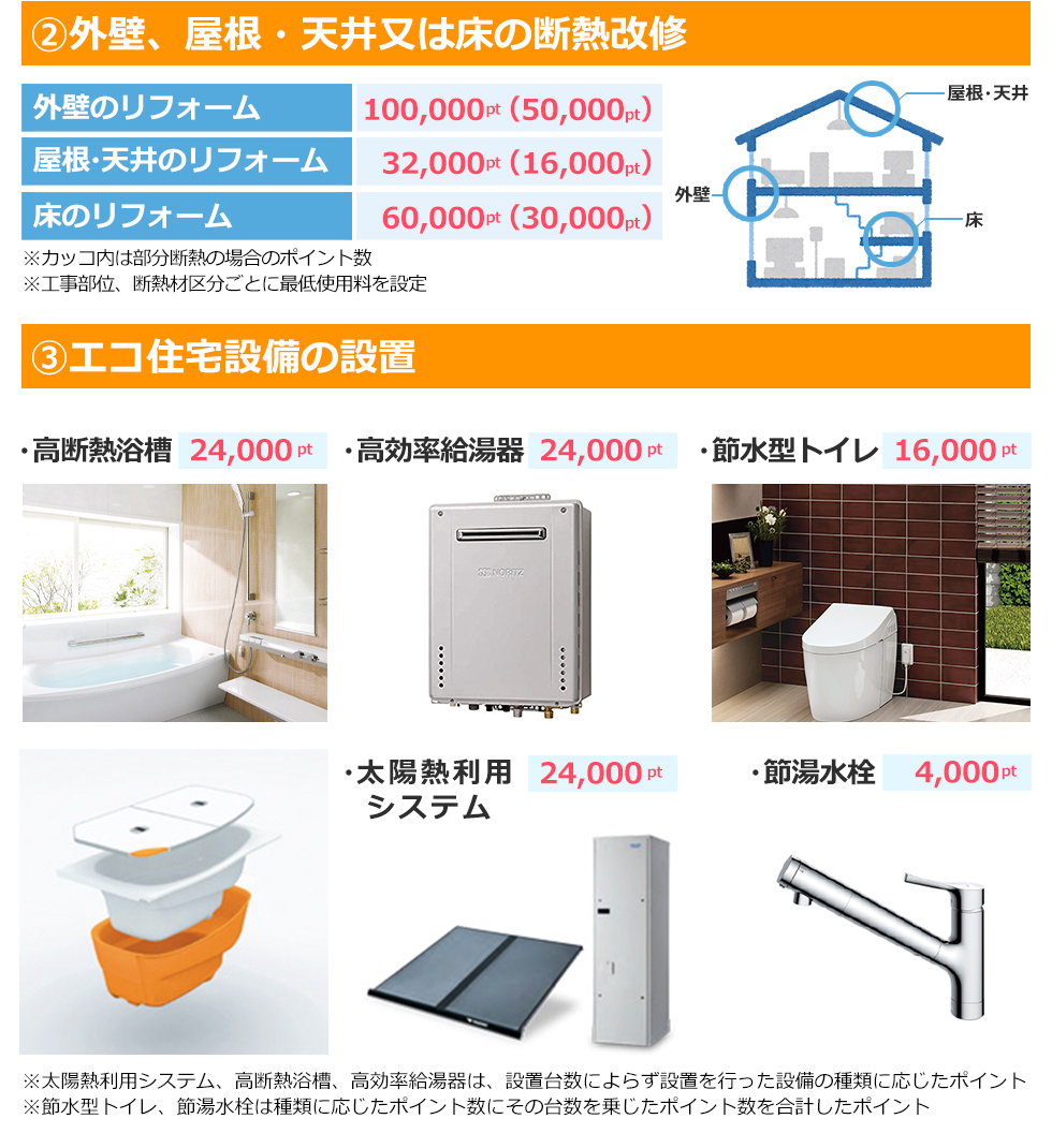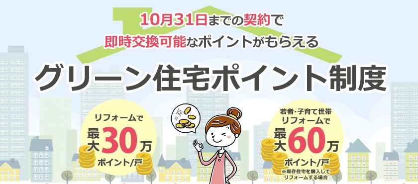 HOMEグリーン住宅ポイント制度について グリーン住宅ポイント制度について グリーン住宅ポイント制度とは? 一定の省エネ性や耐震性、バリアフリー性能等を満たすリフォームを行う場合に、在宅ワークなどの「新たな日常」や防災に対応した商品や追加工事、環境や子育て支援等に対応した商品と交換できるポイントを付与する制度です。今回の制度では、取得したポイントで特定の商品へと交換ができるだけでなく、「即時交換工事」といった獲得したポイントを追加工事の費用として使用することができる点が大きな特徴となっています。(即時交換は対象となる追加工事に限定されます)特例に当てはまる場合、さらに付与ポイントが引上げられます。ポイント分で通常のリフォームよりもお得なリフォームを行うことができますので、制度を有効に活用して快適なお住まいへとリフォームしましょう。 ※本制度の実施は令和2年度第三次補正予算の成立を前提としています。以下の内容は変更がある得ることにご留意ください。※当ページは令和2年12月15日現在の情報を基に制作されています。詳細は国土交通省のホームページをご覧ください。 リフォームで対象となる住宅(持家・賃貸) 対象住宅 上限ポイント(基本の場合) 上限ポイント(特例の場合) ①断熱改修またはエコ住宅設備(必須) ②耐震改修 ③バリアフリー改修 ④リフォーム瑕疵保険等への加入 30万ポイント/戸 60万ポイント/戸 ※特例にあたる条件は、下記いずれかに該当する場合 ①若者(40歳未満)・子育て(18歳未満の子どもがいる)世帯。上限は45万ポイント。既存住宅の購入が伴う場合は上限60万ポイント②①以外の世帯で安心R住宅を購入しリフォームを行う場合、上限が45万ポイントに引上げされます。 制度の対象期間 グリーン住宅ポイント制度の対象期間は限られており、2020年12月15日から2021年10月31日までの期間内に申請を完了したものが対象となります。 ※2021年10月1日より申請期限の延長がされました。 郵送・窓口での申請は2021年11月30日まで オンラインでの申請は2021年12月15日(追加工事交換を伴う完了前申請の場合は、2021年11月30日)となります。 ポイントで交換できる商品・工事 グリーン住宅ポイントと交換できる商品・工事共に、新型コロナウイルスの影響から「新しい生活様式」を意識したものが対象となります。 「子育て支援、働き方改革」の項目から時短につながるアイテム(家電など)など、具体的な内容については準備が整い次第発表される予定です。 ※具体的な交換可能な商品などの情報が出次第随時更新をしていきます。 下記に資する商品 ①「新たな日常」に資する商品 ②省エネ・環境配慮に優れた商品 ③防災関連・健康関連商品 ④家事負担の軽減・子育て関連商品 ⑤地域復興に資する商品 追加工事 「新たな日常」(テレワークや感染症予防)及び「防災」に対応した追加工事 ※住宅の新築(賃貸)は追加工事のみ ポイント交換申請期間 ・商品交換の場合:準備が整い次第~2022年1月15日(予定) ・追加工事の場合:準備が整い次第~2021年10月31日(予定) ※2021年10月1日より商品交換申込期限が2022年2月15日に延長がされました。 対象となるリフォーム工事のポイント数 1戸あたりの発行ポイント数は下記①~⑦の条件に応じて発行される合計となります。 なお、1申請あたりの合計ポイント数が50,000ポイント未満の場合はポイント発行申請ができません。 住宅のプロにお早めにご相談ください グリーン住宅ポイント制度は一見すると難しく、適用できるかどうかもお客様の状況や条件によって異なります。まずは住宅のプロの私たちにご相談ください。 皆様がお得に各種工事を行えるよう、お客様おひとりおひとりにとって最適なプランをご提案させていただきます。 フォーシンクについて 選ばれる理由 会社案内代表挨拶会社概要アクセスマップ表彰実績経営理念・経営方針イマックスグループ情報 スタッフ紹介 施工事例 施工事例一覧 エコキュートリフォーム 窓リフォーム 1DAYリフォーム 内窓 こんな事もやります ペレットストーブ キッチンリフォーム お風呂リフォーム トイレリフォーム 洗面化粧台リフォーム LDKリフォーム 内装リフォーム 玄関・ポーチリフォーム 設備交換リフォーム 外構リフォーム 外壁リフォーム 屋根リフォーム リノベーション お客様の声 お客様の声一覧 商品ラインナップ おすすめ商品一覧 こんな事もやってます メンテナンス 建物診断 まごころサービスラインナップ 洗面化粧台 トイレ 玄関 床材 キッチン 浴室 お役立ち情報 フォーシンクのWEBチラシ 「中古を買って、リノベーション」という選択。 リフォームの流れ よくある質問 LINE見積もり 住宅省エネ2026キャンペーン 先進的窓リノベ2026事業 みらいエコ住宅2026事業 給湯省エネ2026事業 ブログ ブログ一覧 日々のフォーシンク 現場日記 建築士のリフォームお役立ちブログ メディア掲載情報 その他・地域情報 お問い合わせ お問い合わせ 無料お見積もり こちらもご