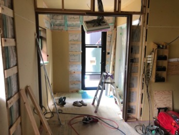 洗面脱衣場とダイニングの間仕切となる片引き戸の建具枠を施工いたします