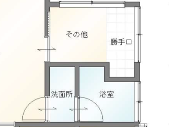 | お客様のご要望 | ①いびつな形の浴室空間をなんとかしたい ②狭い洗面脱衣場をどうにかしたい ③勝手口へ行く空間が広すぎるのでスッキリしたい ④電気温水器が古いのでこの際 新しくしたい |