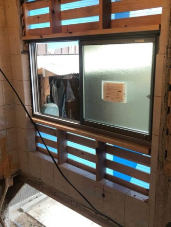 土間の養生期間を利用して、浴室の新しいサッシを取り付けます。