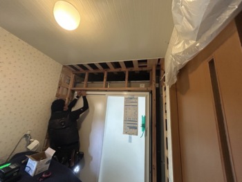 壁下地を組んだ後、石膏ボードを張り、間仕切り壁と脱衣場拡張部に新しく床と天井が出来ました。