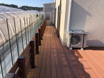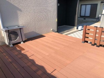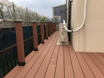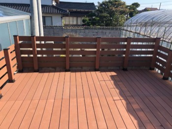 | ご提案内容 | 屋根の無い雨ざらしとなる環境でしたので、高儀製の人工木ウッドデッキ&ウッドフェンス”ネオカットウッド”を提案させていただきました。本商品は、天然木粉と樹脂の複合材ですので、水に強く腐りにくく、シロアリ等の食害もありません。また、天然木デッキのような防腐剤塗布等のメンテナンスも必要ありません。また、シックハウス等の原因物質も使用していません。更に、デッキを支える樹脂根太材は純度の高い工場廃材樹脂を主原料とした発泡処理したムク材で、木に近い硬さでできています。 |