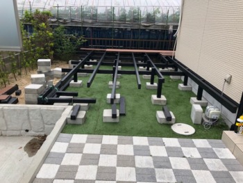 既存の人工芝はそのままでウッドデッキを施工していきます