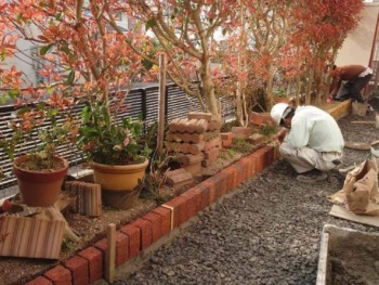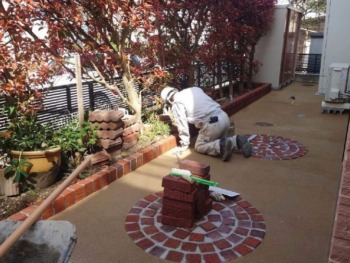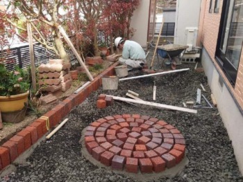 アクセントでピンコロレンガを円状に敷き詰めていきます