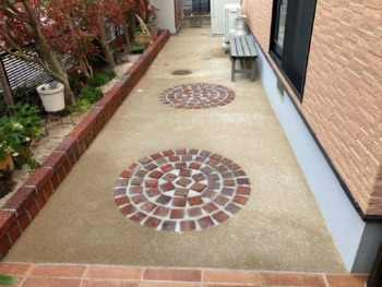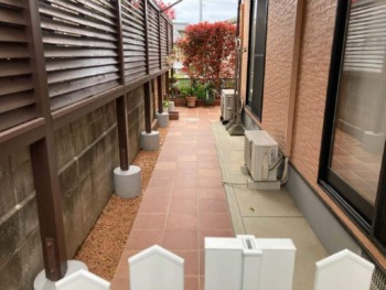 フェンスのブロックラインは瓦チップを敷き詰め通路はタイル仕様です