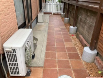 ①サンルームが雨漏り⇒サンルームの撤去 ②庭の水はけが悪く水はけ改善⇒地中にネトロンパイプを埋設+砕石敷 ③庭を明るい雰囲気にしたい⇒タイルとレンガ&ピンコロでリニューアル+固まる土で水溜まり対策 加えて既存の木製フェンス&外壁のサンルーム接地面を外壁塗装のご提案をいたしました |