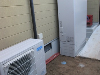 ヒートポンプはエコキュートのメンテナンススペースを考慮して若干離して設置いたします