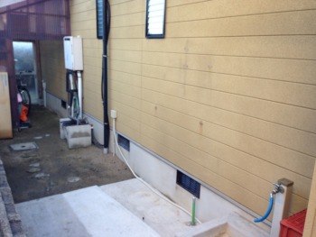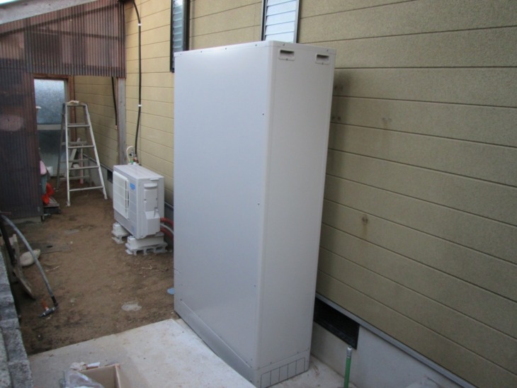 外壁と土間スロープに薄型エコキュートがスッポリと納まりました