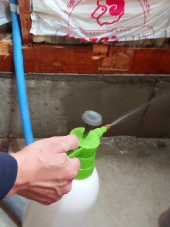 トイレの床を解体した後にはホウ酸水溶液処理にて木材劣化対策も行いました