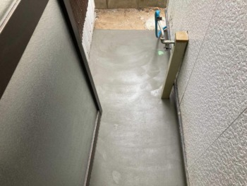 床の工事と並行して、デッキスペースに土間モルタルを打ちました。