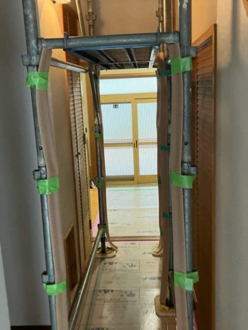 吹き抜けクロス張替の為、内部足場を組んでいます。クッション材で養生しケガの無いよう配慮させていただきました。