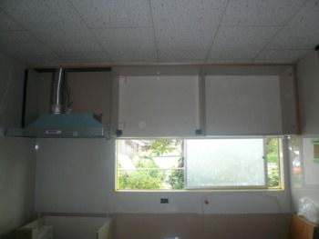 システムキッチンはまずキッチンパネルから施工してその後レンジフード・吊戸棚を施工していきます