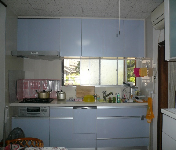既存の吊戸棚500㎜より200mm伸ばした戸棚をご提案致しました。棚を大きくすることにより窓に掛かってしまっていますが、キッチン廻りが明るくなるよう窓枠にキッチンパネルを貼付けて光の反射とキッチンの色あいの相乗効果でカバーできるようなプランご提案致しました。合わせて天井壁クロス張替・床はクッションフロアの貼り替えを提案させていただきました |