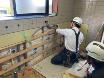 ウォールユニットの取り付け部に下地を入れ、全面に断熱材を入れ、ボードを貼ります。
