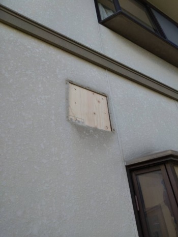 換気扇を外した内壁に断熱材を入れボードを貼ります