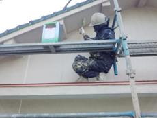 | ローラーでムラなく丁寧に塗料を塗っていきます。 | 軒裏も外壁と同じように作業します。 | 目立たない細部まで丁寧に、タレないように慎重に塗ります。 |