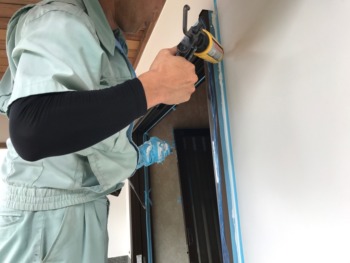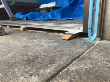 既存サッシ撤去後 既存のサッシ枠と新規サッシ枠の取り合いを調整中です
