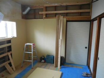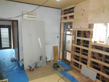 パテが乾いたのを確認してからクロスを貼りいよいよシステムキッチンを施工します