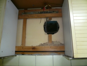 取り外すと換気ダクトが丸ではなく 四角のダクトが現れ本体は戸棚の間に収まりますが吸込み口が戸棚の下に突き出た板に接触する事が判明しました・・