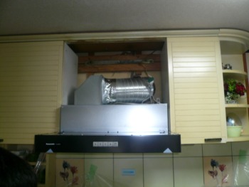 ダクト部分を加工して接続後 吸込み口部分は戸棚の下に突き出た板を お客様の了承を得て切断させてもらいました