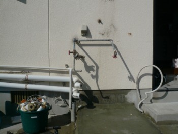 貯湯ユニットを基礎に設置した後に、給排水の試験運転を実施します