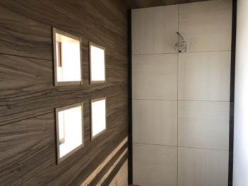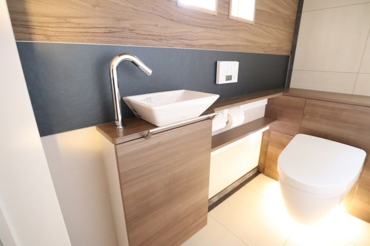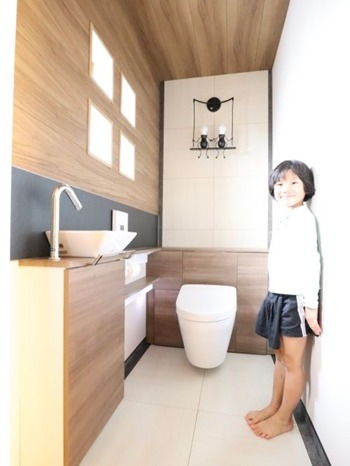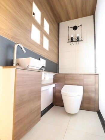 | 使用商材 | 便器/手洗器:レストパルF(ソフトミディアムウッド)+アクセントパネル(シャドウブラック)・建具:LIXILラシッサD(ラテオ)・床:南海プライウッド/アートフロア(サンドブラック/ピエールベージュ)・化粧板壁:シエロシーリング(ソフトミディアムウォールナット)・ |