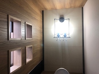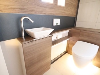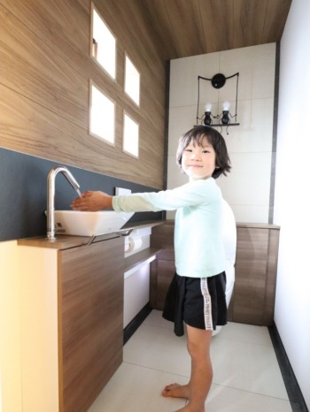 ギリギリで採用した手洗器部分のブラック基調のアクセントパネルも雰囲気アリます