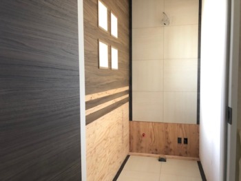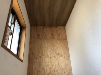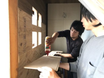 天井と化粧板で施工後 壁補強のために12㎜の構造用合板を2重張りします