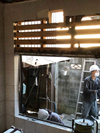 新しいサッシの大きさと位置を考慮し、外壁も解体します。