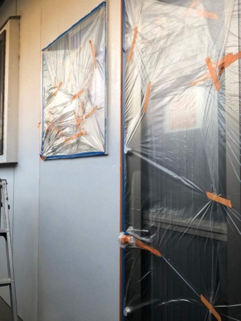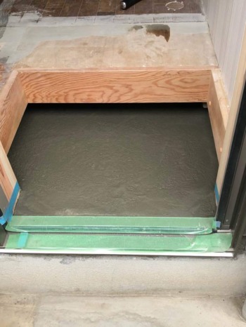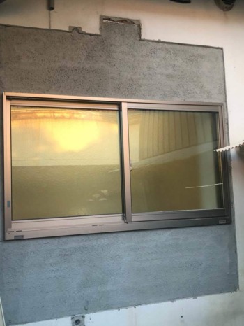 土間の養生期間を利用して、浴室の新しいサッシを取り付けます。