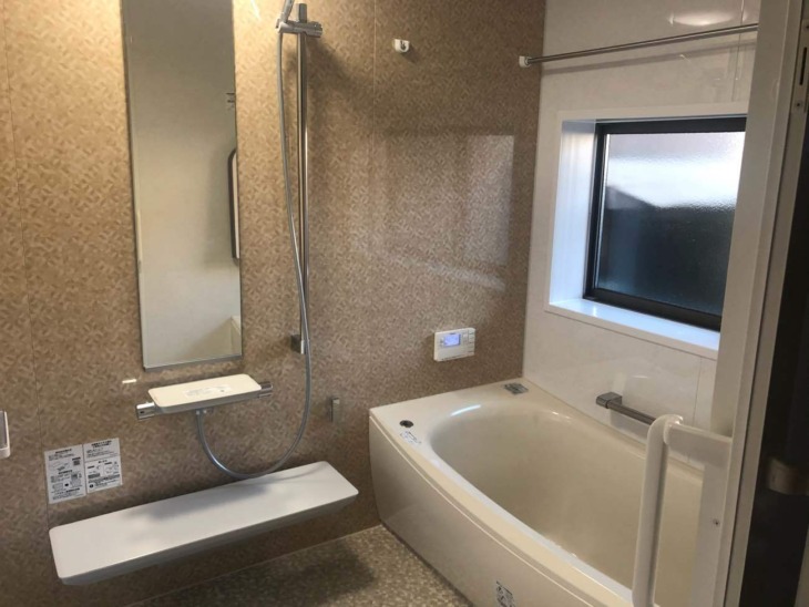 システムバスのアクセントパネルと床の色をブラウン系で統一され、温かみがあり落ち着いた空間になりました。 見た目はもちろん、機能も充実した浴室になりました。