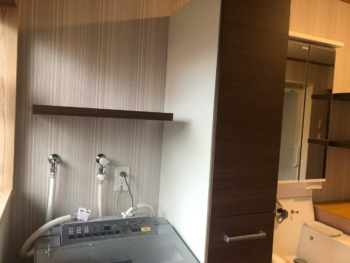 洗濯機上と、タンスの上には、洗面台の扉カラーと同色のインテリア収納棚を取付けました。