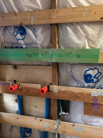 脱衣場の壁を一部解体し、洗濯機と洗面台の新しい設置場所に給水管を伸ばします。