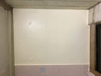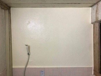 タイル造の浴室空間です⇒一番劣化の激しかった正面壁のみを塗装で保護させていただきます
