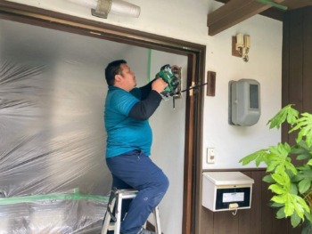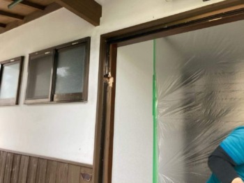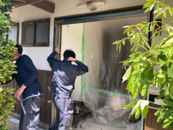 まずは養生を行い既存の玄関引き戸+付帯枠を撤去します