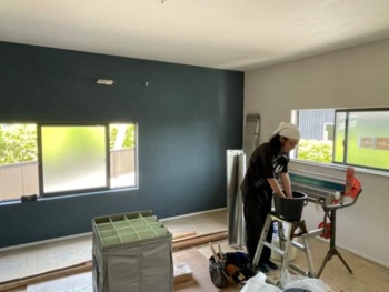 アクセントとなる壁クロスを施工中です