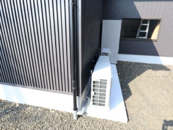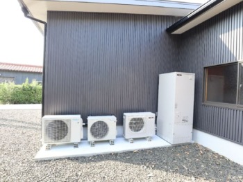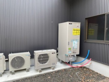 新たにコンクリートを打設した箇所にエコキュート・ヒートポンプ+エアコンの室外機を2台設置させていただきました