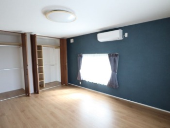 部屋東面はアクセントでインディゴ色のクロス+遮光カーテン&LIXIL内窓”インプラス”を施工させていただきました