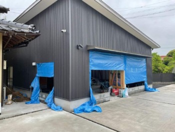 まずは倉庫正面の3枚サッシを2ヶ所撤去して壁を新設するための基礎を施工します