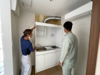 ミニキッチン設置後 下がり壁の施工位置と換気扇ダクトスペースの打ち合わせを行います