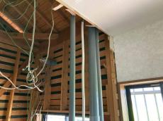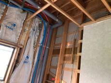 新しいシステムバスを設置するにあたり配管が干渉するため、脱衣場の天井と壁を使って配管していきます。