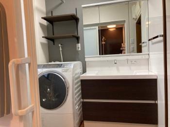 洗濯機上の棚は、洗面化粧台の扉色と合わせて塗装し統一感を出しました。