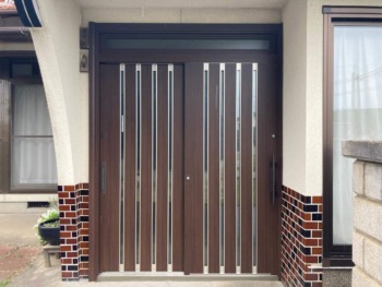 | ご提案内容 | 採光の取れる明るい玄関をご希望でしたので、欄間付きの玄関ドアをご提案いたしました。 既存の窓枠と同じようなブラウン系で統一し、外観も全体的に違和感の無いようにご提案しました。 |