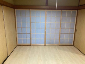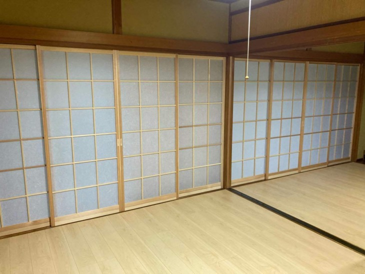 真ん中の4枚戸を閉めると、完全に部屋が仕切れるようになりました。欄間にもフラッシュ板戸をはめ込んで、気密性とプライバシー性を高めました。